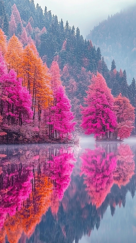 This is an artistic rendering of a landscape, possibly depicting a forest of larch trees in autumn. Larch trees are deciduous conifers, meaning they have needles that turn yellow and fall off in the autumn. They are known to be fast-growing and are found in pure or mixed forests.