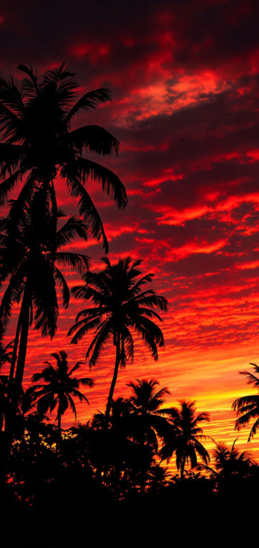 This image is a photo of palm trees silhouetted against a red and orange sunset. The image has been used in various contexts, including social media posts and as a visual for a music track.