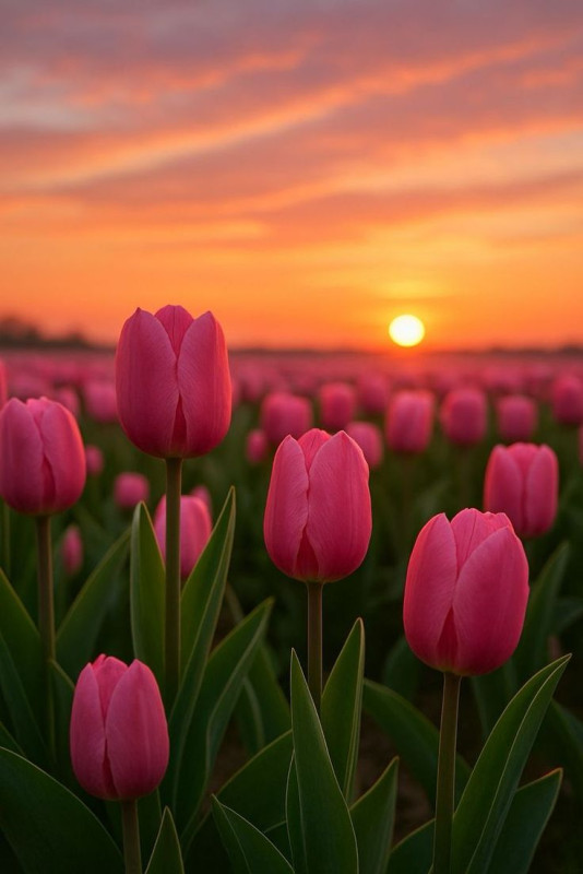 This image shows a field of pink tulips at sunset. Tulips are spring-blooming flowers in the genus Tulipa and are a member of the lily family. Most of the tulip cultivars cultivated today are derived from the species Tulipa gesneriana, also known as the Didier's tulip or garden tulip.