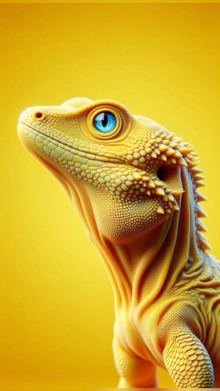A stunning digital artwork of a bright yellow lizard with vivid blue eyes against a smooth yellow background. The image highlights the creature’s textured scales and detailed skin, creating a mesmerizing and vibrant composition.