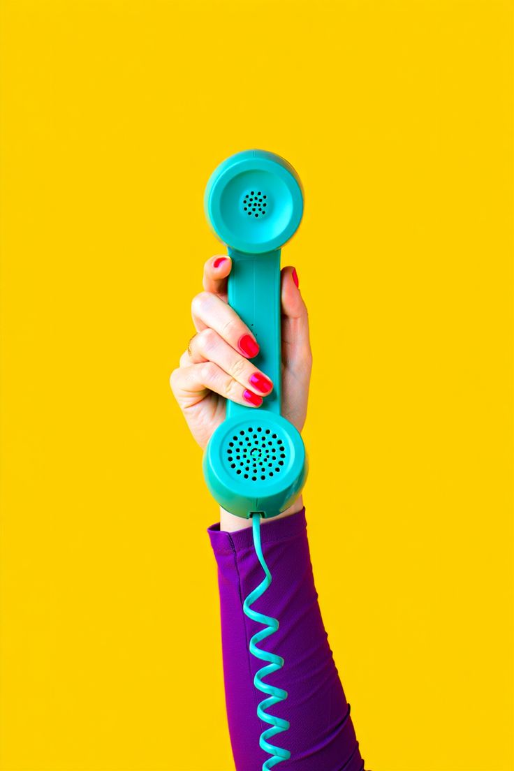 The image is a vibrant stock photo featuring a hand with red nail polish holding a turquoise or blue vintage-style telephone receiver against a bright yellow background.