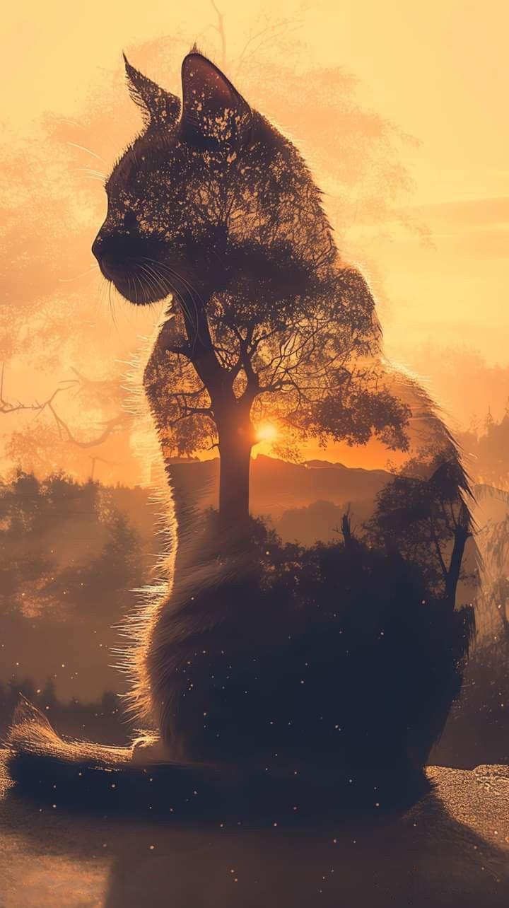 A mesmerizing digital artwork featuring the silhouette of a cat blended with a sunset forest scene. The image beautifully combines nature and animal imagery, creating a dreamy, double-exposure effect perfect for wallpapers or artistic inspiration.