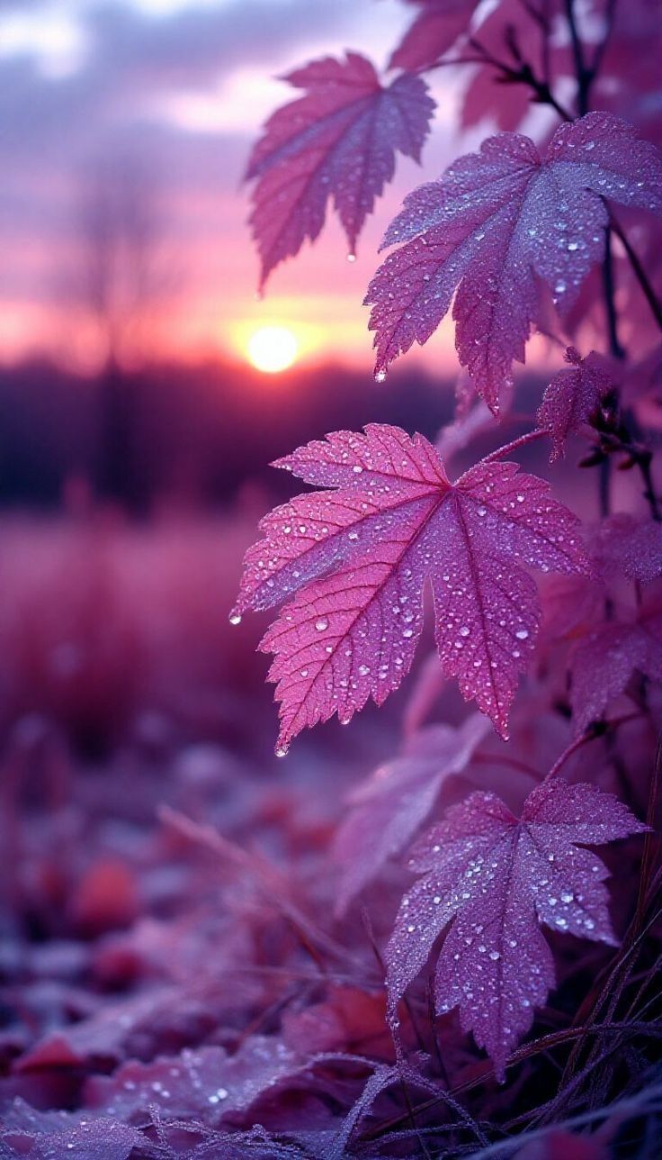 This is a close-up photo of a purple maple leaf with water droplets on it, possibly taken during a sunrise or sunset.